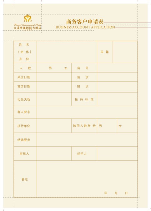 這張是江蘇夢溪國際大酒店的商務客戶申請表,表上的設計內容分別有姓名、團體、身份、國籍、人數、男、女、房號等等的入店信息(詳細信息可以圖上的樣式表)。