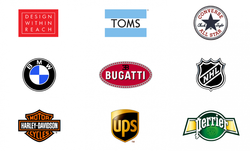 會(huì)徽公司標(biāo)志的示例包括:Design Within Reach、Toms、Converse、BMW、Bugatti、NHL、Harley Davidson、UPS 和 Perrier。